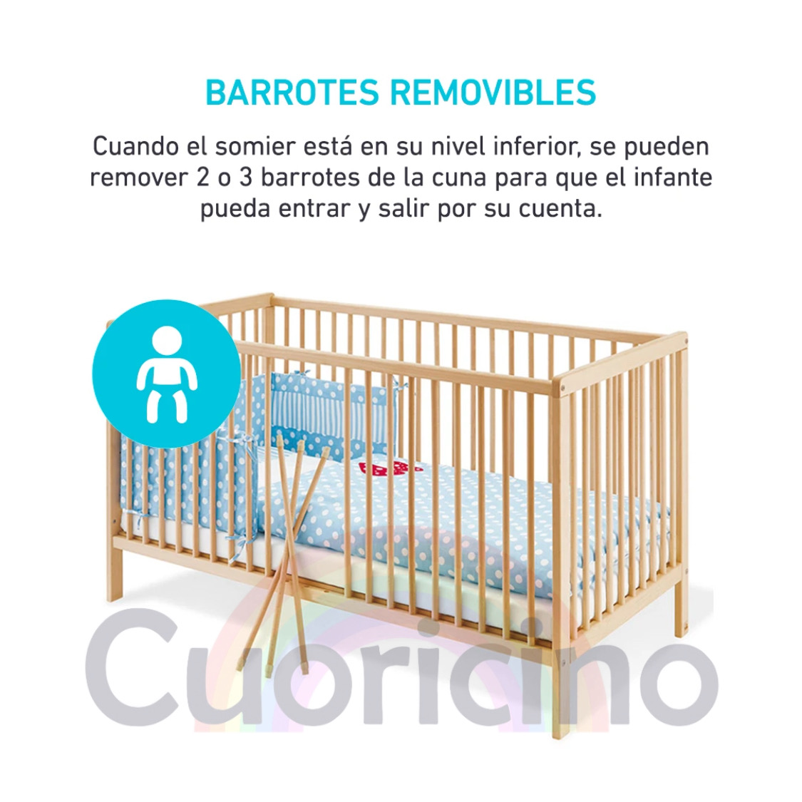 Cuenta con 3 barras removibles las cuales facilitaran el subir/bajar cuando el bebé pueda realizarlo por si solo. Además, esta increíble cuna se transforma en cama de transición, lo que permitirá utilizar este producto por mucho tiempo!