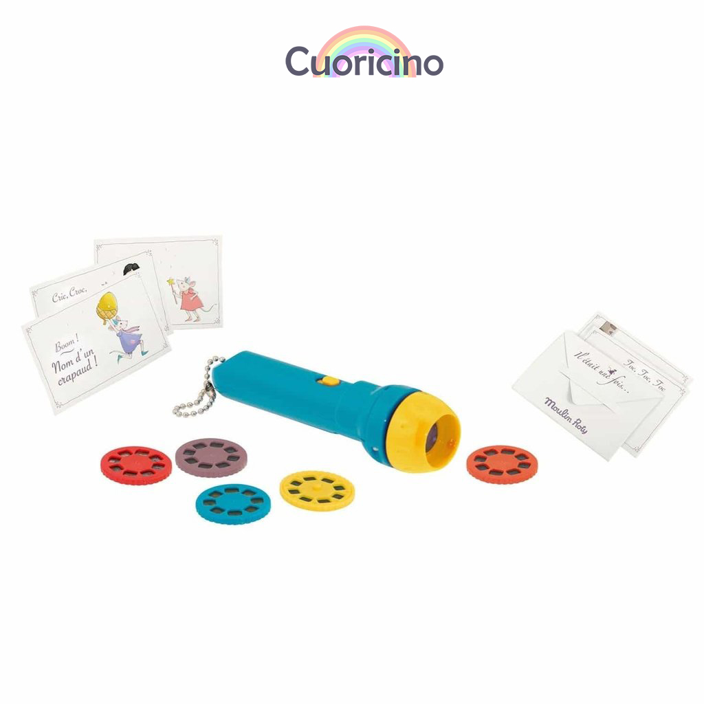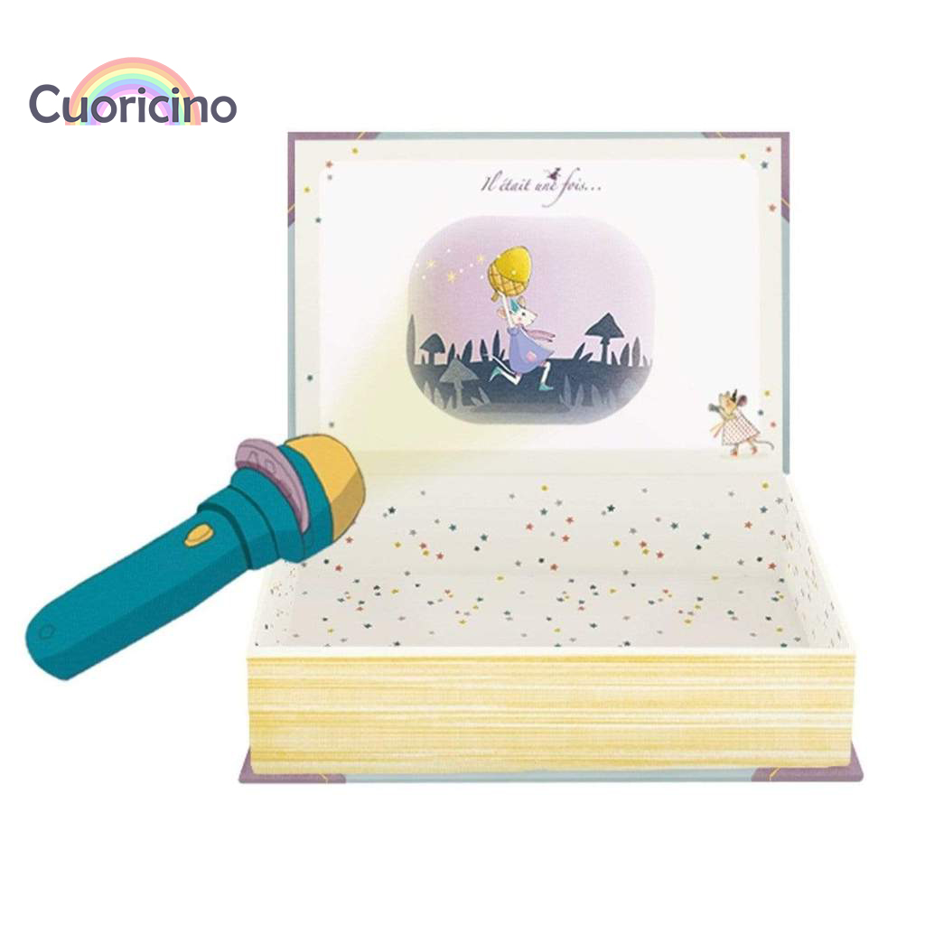 Dentro de la caja en forma de libro encontrarás la linterna-proyector de cuentos, con la cual podrás proyectar 5 historias.