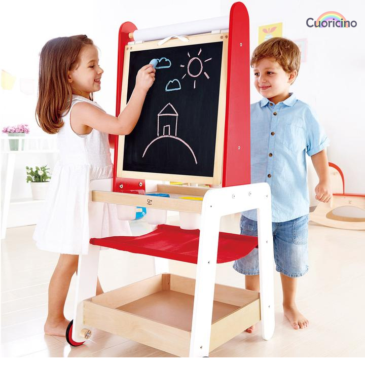 Este caballete de dos caras, ajustable y de fácil desplazamiento, viene completo con pizarra negra y pizarra blanca, ruedas y un amplio espacio de almacenamiento. ¡Es perfecto para su pequeño Picasso!