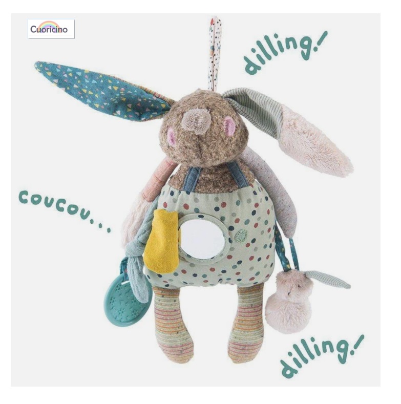 Este simpático juguete será el compañero ideal para desarrollar los sentidos de tu bebé. Tiene diferentes accesorios que le permitirán descubrir diferentes sonidos y texturas: un anillo de dentición para aliviar el dolor de las encías, un sonido de campana cuando se mueve, un espejo en su guatita para divertir al bebé, papel crujiente en sus oídos, un sonido de cascabel en el conejo, un sonido chirriante en su cabeza e incluso un arco para masticar! Fácil de agarrar y manejar con manitos pequeñas, este conejo se puede llevar a cualquier lugar.